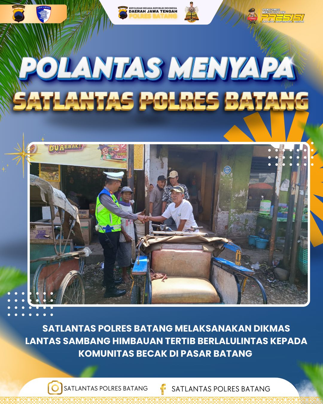 Satlantas Polres Batang melaksanakan kegiatan Pendidikan Masyarakat Lalu Lintas (Dikmas Lantas) dengan menyambangi komunitas becak di kawasan Pasar Batang, Kabupaten Batang, pada [selasa,16 Desember 2025].