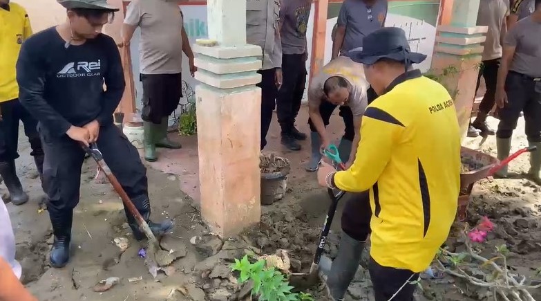 Bireuen — Kepolisian Resor Bireuen bersama jajaran Polsek melaksanakan gotong royong pemulihan pascabencana banjir bandang di SD Negeri 11 Kutablang, Desa Keurumbok, Kecamatan Kutablang, Kabupaten Bireuen, Minggu (18/1/2026).