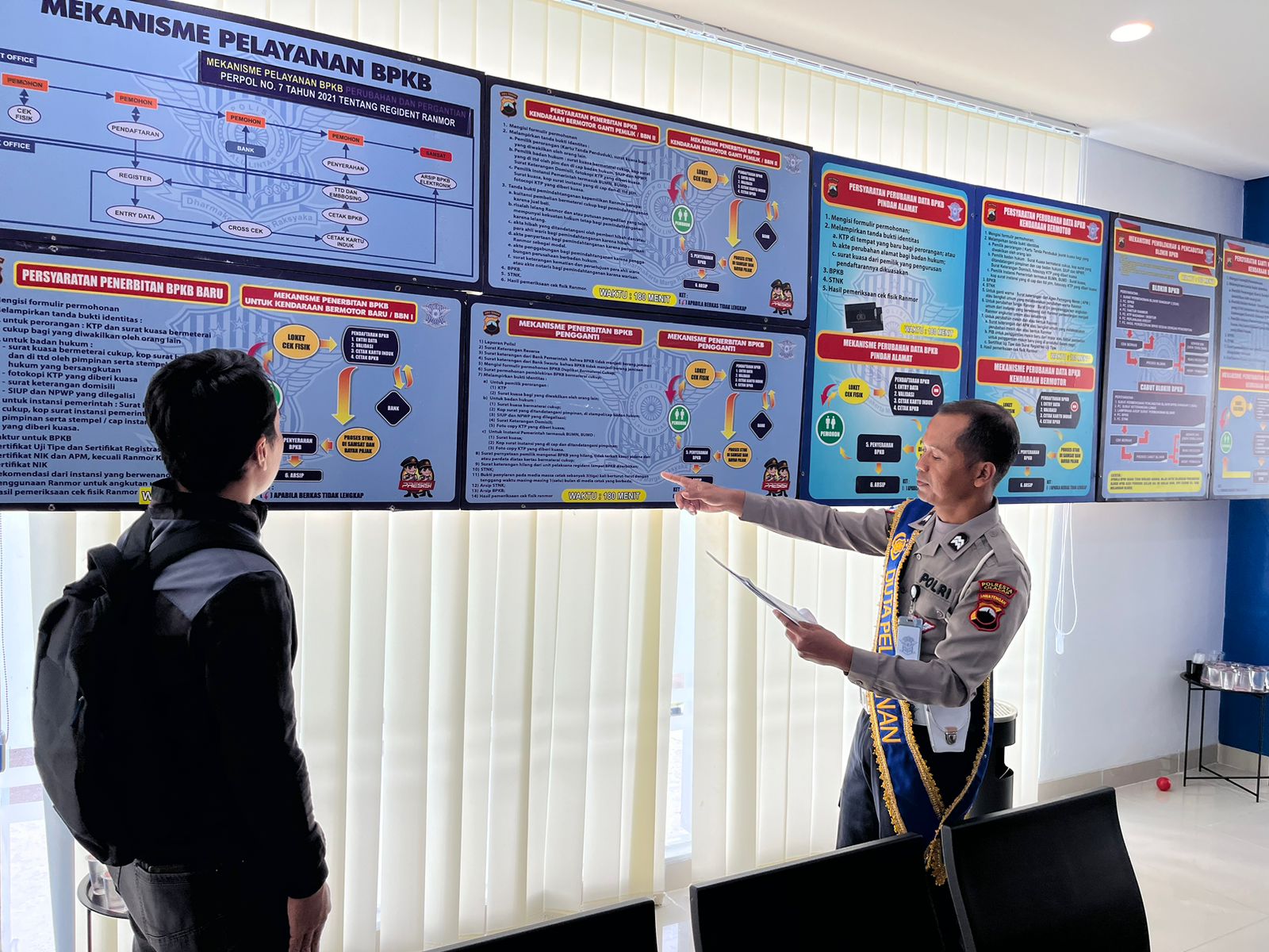 Cilacap – Petugas Unit BPKB Satlantas Polresta Cilacap melaksanakan kegiatan sosialisasi dan edukasi kepada masyarakat terkait mekanisme pelayanan penerbitan Buku Pemilik Kendaraan Bermotor (BPKB) melalui Papan Informasi Pelayanan BPKB.
