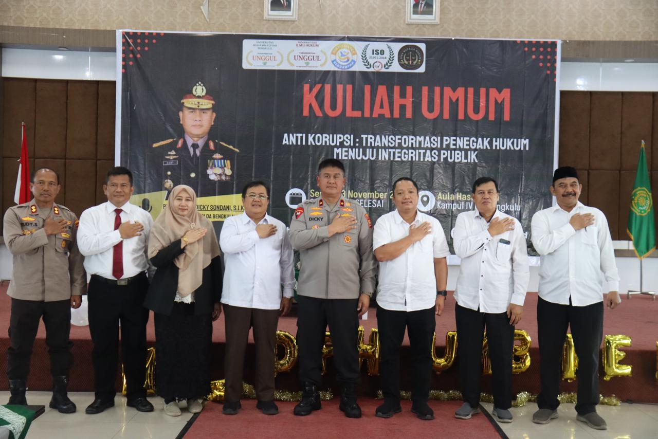 Wakapolda Bengkulu, Brigjen Pol. Dicky Sondani S.I.K., M.H., menjadi narasumber dalam Kuliah Umum dengan tema “Anti Korupsi: Transformasi Penegak Hukum Menuju Integritas Publik” di Universitas Muhammadiyah Bengkulu (UMB) pada Senin, 3 November 2025. Kegiatan ini dilaksanakan dalam rangka Dies Natalis Fakultas Hukum UMB ke-17 Tahun 2025.